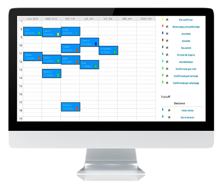Con opciones de vista mensual, semanal o diaria. Detalla el estado de las citas (por confirmar, atendida, confirmada por WhatsApp, entre otros).